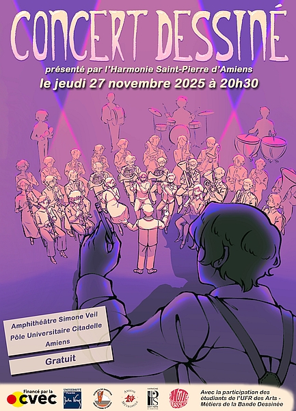 Pour la Sainte Cécile, patronne des musiciens, l'Harmonie Saint-Pierre d'Amiens vous convie à un nouveau Concert Dessiné exceptionnel réalisé en collaboration avec des étudiants de l'UPJV - UFR des Arts, section Métiers de la Bande Dessinée.