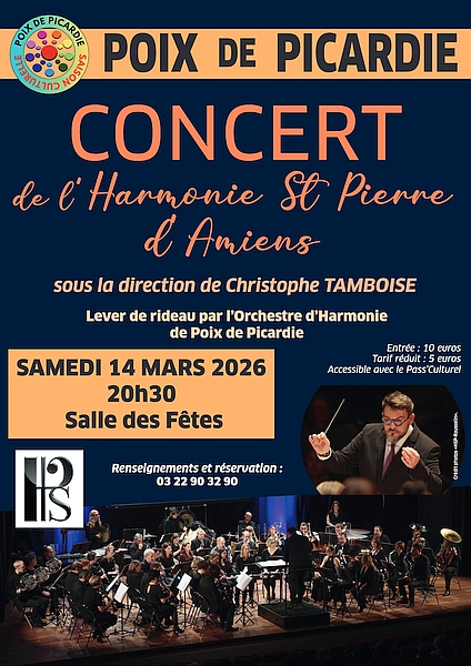 Lieu : Salle des fêtes de Poix-de-Picardie (Plan) L'Harmonie Saint-Pierre d'Amiens dirigée par Christophe Tamboise donne ce concert de gala qui s'inscrit dans la saison culturelle de Poix-de-Picardie.